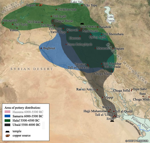Tras el reemplazo de las culturas hassuna y samarra por la cultura halaf alrededor del 5500 a. C., la ubaid emergió como rival meridional en Sumer alrededor del 4500 a. C. Esta también se desvanece, y su sucesor es el período Uruk IV.